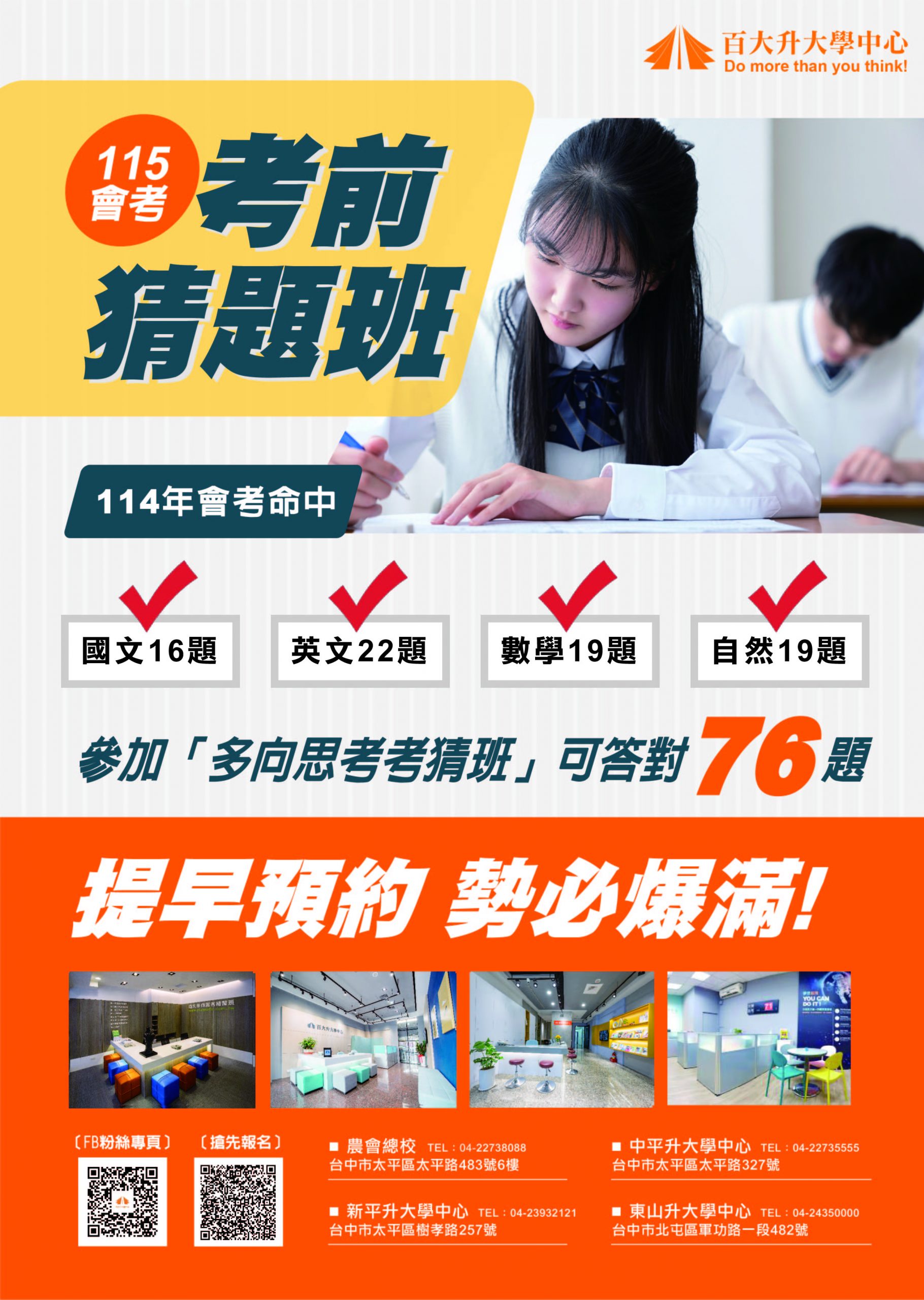 2026-03-28 115年會考考前猜題班 強檔活動 115會考考前猜題班 READ MORE . 作者: 作者: mymath01 分類: 國中課程, 本班公告, 課程資訊 強檔活動 115會考考前猜題班 READ MORE . 國三會考 115年5月 去報名考猜